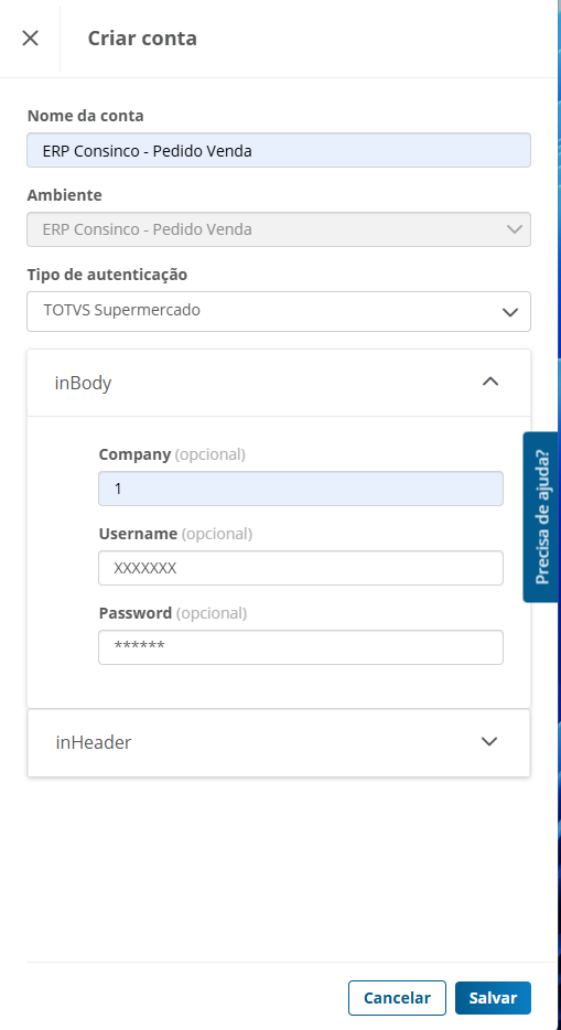 Vá novamente no combo de seleção do ambiente e selecione o que acabou de cadastrar ERP Consinco - Pedido Venda na sequência vá até combo de Conta e clique sobre o botão Cadastrar conta, preencha com os seguintes dados: