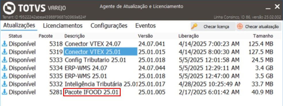 Para baixar o pacote do Conector iFood, será através do Agente de Atualização e Licenciamento. No agente aparecerá sempre o último pacote disponibilizado pelo time de produto, e será sempre a última versão corrente, por exemplo, na imagem abaixo temos o pacote 25.01, mesmo que o ERP ainda trabalhe com as versões 24.07 e 25.01, no Conector iFood só existirá a 25.01. Quando liberarmos a versão 25.07, somente a versão 25.07 existirá.
