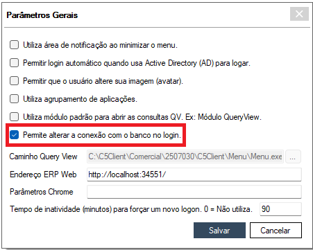 A escolha da base de dados na tela de login é ativada pelo parâmetro ‘Permite alterar conexão com o banco no login’ disponível nos ‘Parâmetros Gerais’ e possui controle de permissão por usuário.