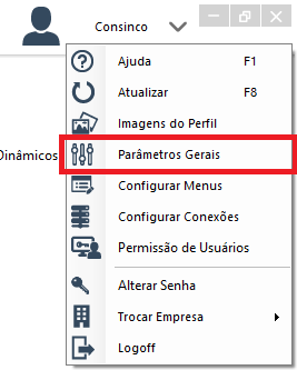 No menu do usuário, visualizado no canto superior da tela, é possível acessar a documentação (atalho F1), atualizar o menu e as notificações (atalho F8), acessar e alterar a imagem do perfil, configurações de parâmetros, configurar os menus, trocar a empresa, alterar senha e fazer logoff.
