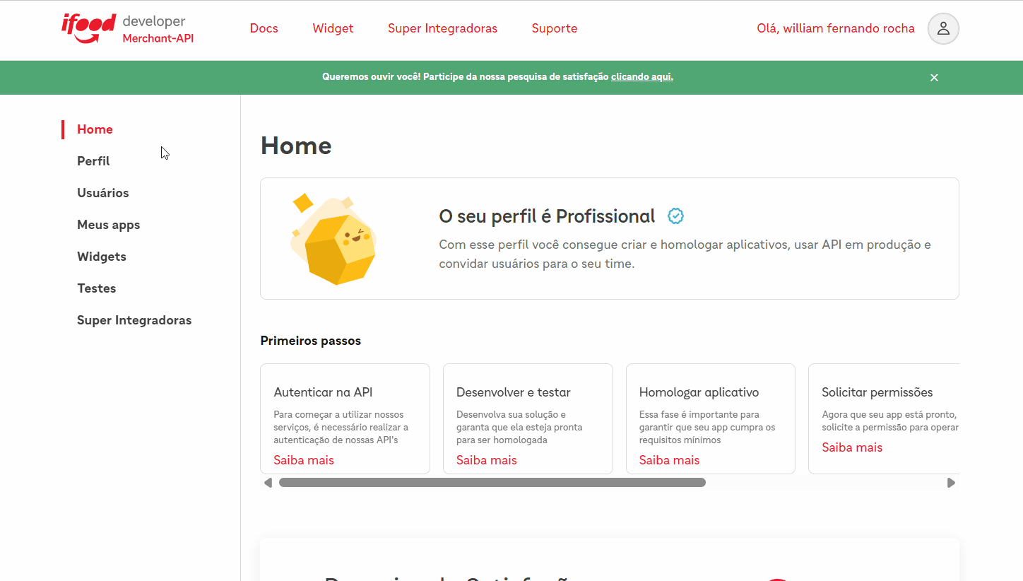 Acesse a plataforma do iFood através do link: https://developer.ifood.com.br/