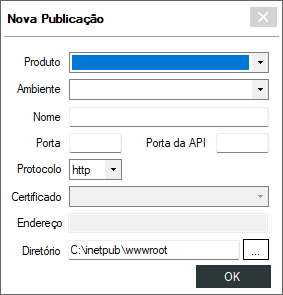 Porta da API: Para uso interno. Para publicações que não utilizam o site de API, basta informar a porta 0. Se informada a porta do site de APIs já publicado, o novo site passará a utilizá-lo também.