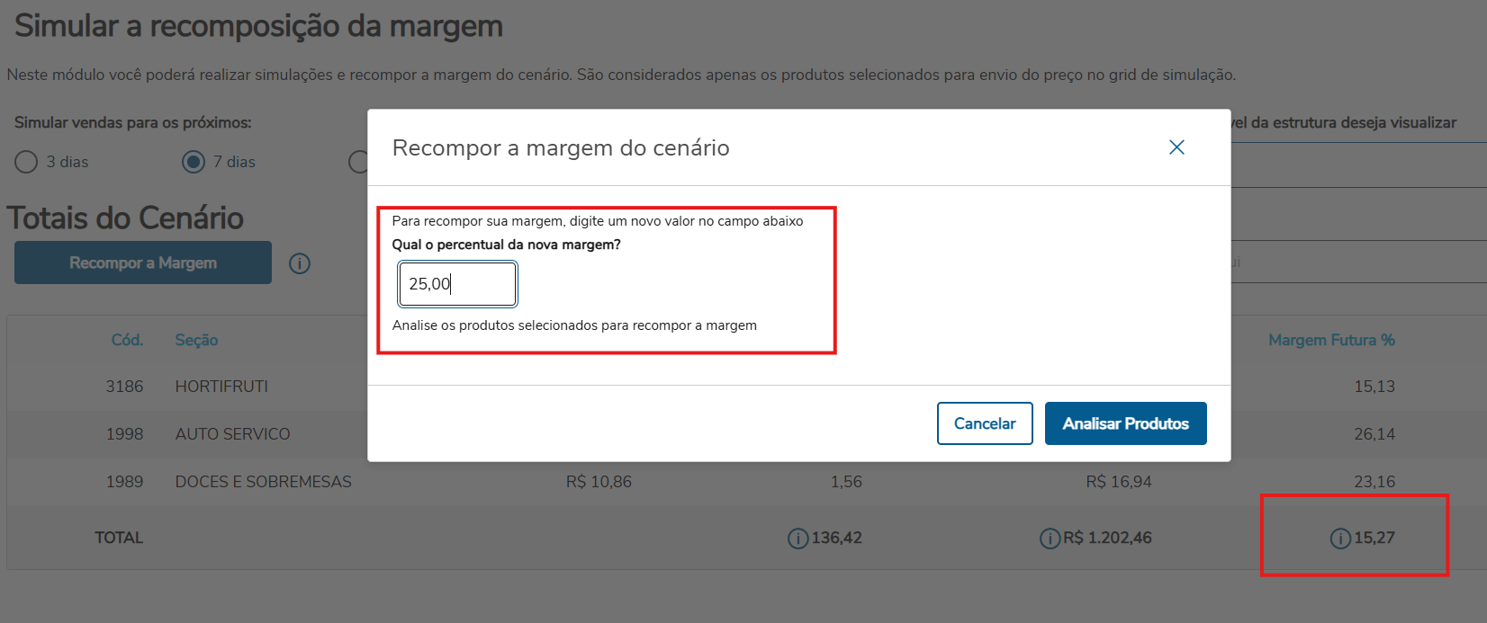 | Caminho: | Inicio > Cenários > Meu Cenário > Simular a recomposição da margem |