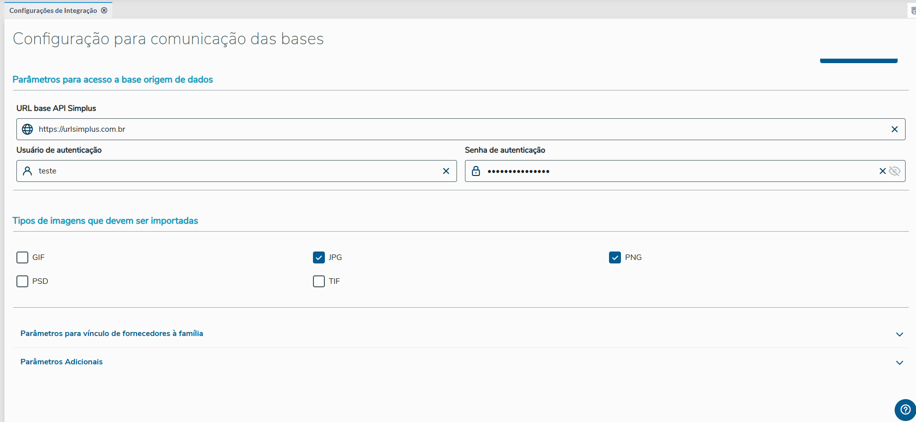 Na caixa de seleção Tipo de importação, selecione a opção Cadastros de Produtos - Base Simplus e desta forma ficará disponível na aba Configuração Geral, os campos para configurar os parâmetros de acesso à base de dados.