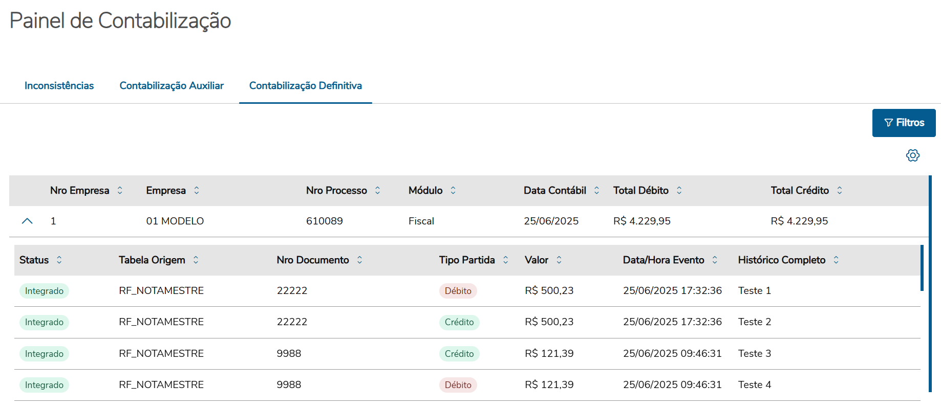Dentro do Painel de Contabilização, na guia Definitiva, eram exibidos todos os registros, porém a visualização deles não era muito fácil e se repetia a cada processo.