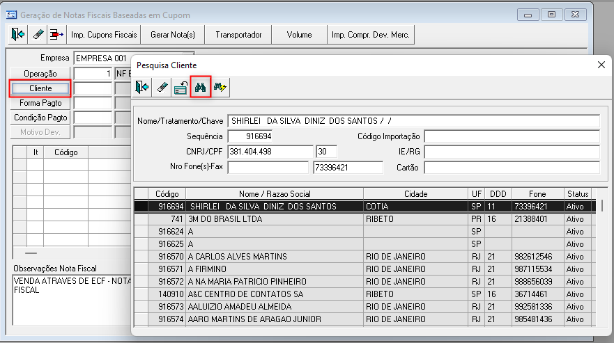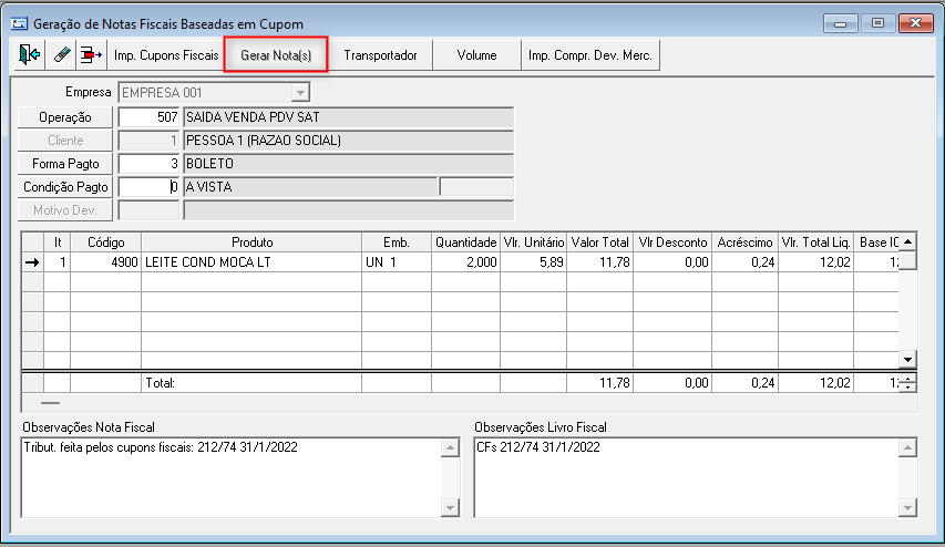 Loja > Vendas > Gera NF Base Cupom Fiscal