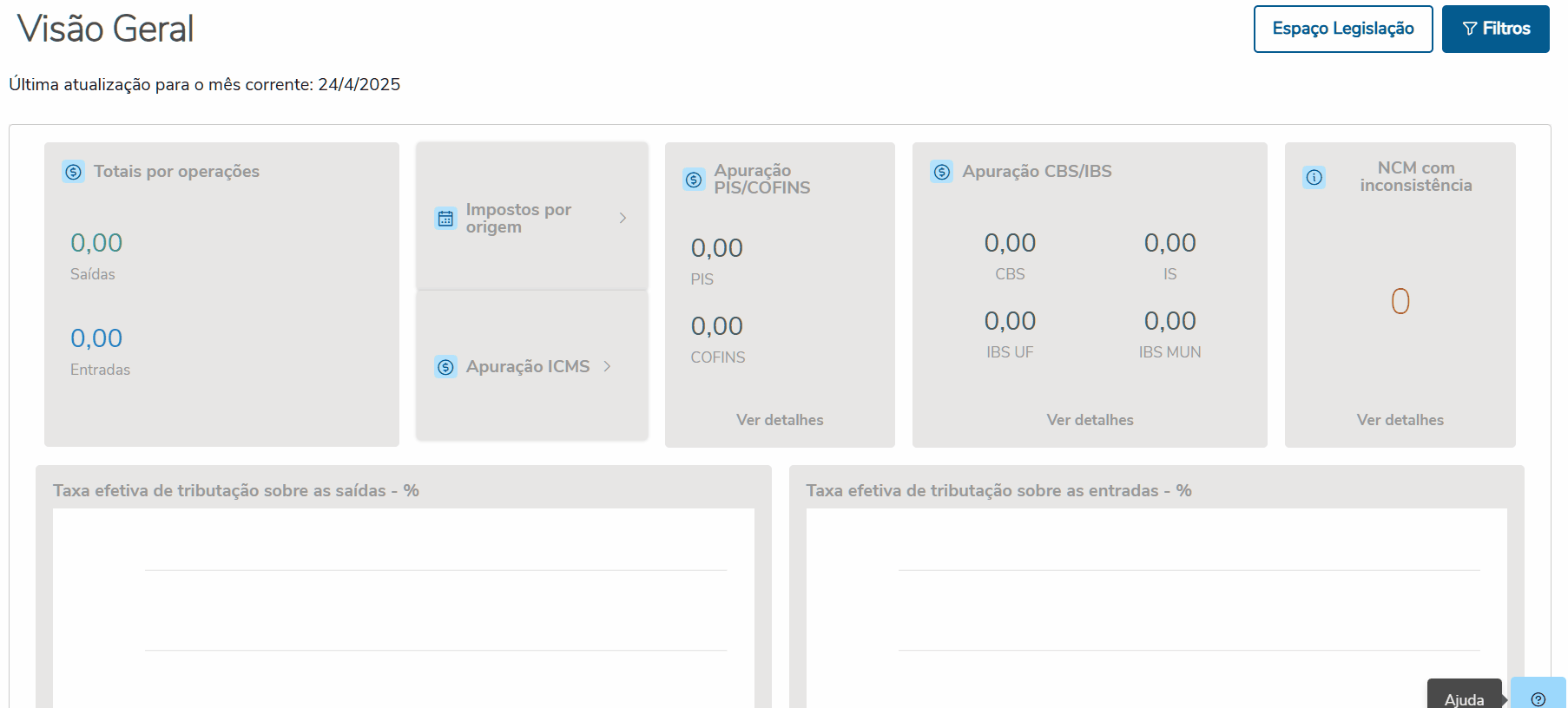 Ao entrar na tela inicial, os valores do sistema estarão todos zerados, pois, será necessário inserir os dados no filtro e depois gerar os resultados.