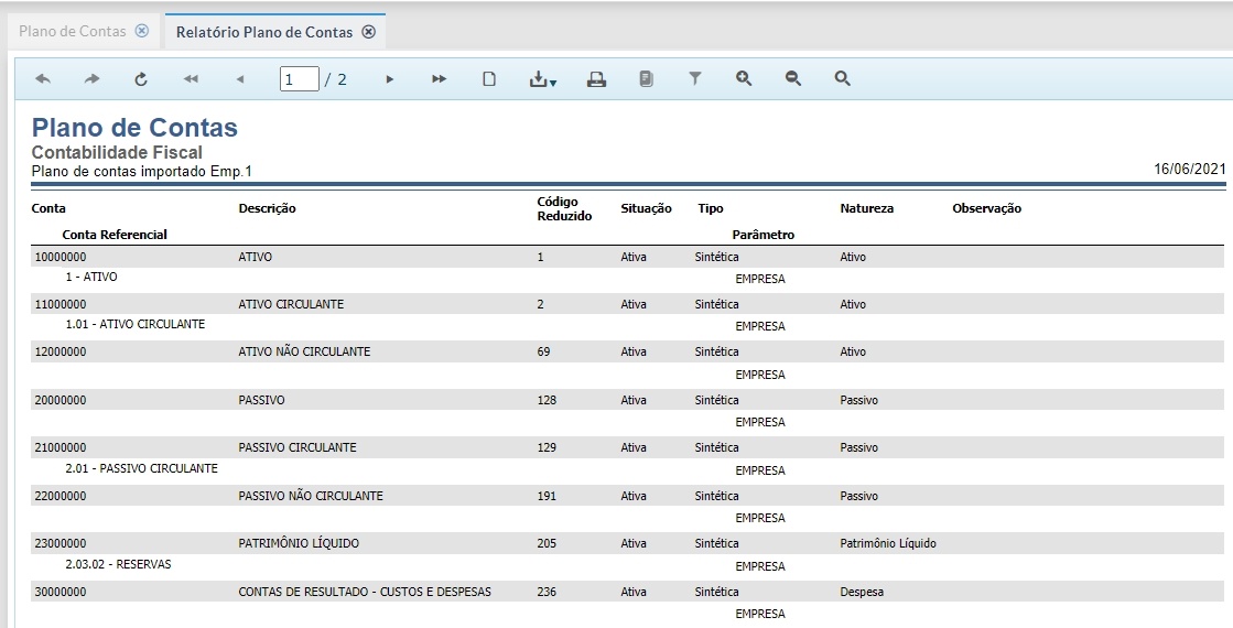 Módulo Contábil > Menu Relatórios > Plano de Contas – ABA_00053.