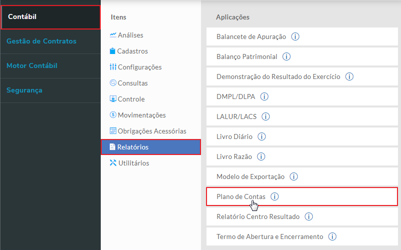 Acesse o Módulo Contábil, clique no menu Relatórios, em seguida clique em Plano de Contas.
