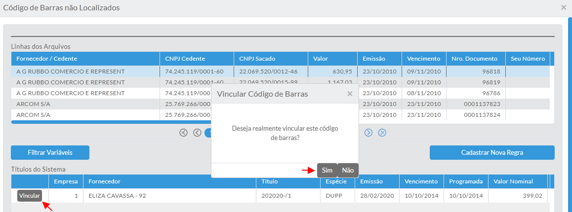 Ao clicar em Sim o código de barras é vinculado ao título, sendo alterado ainda o status do título, caso clique em Não, volta a tela anterior.