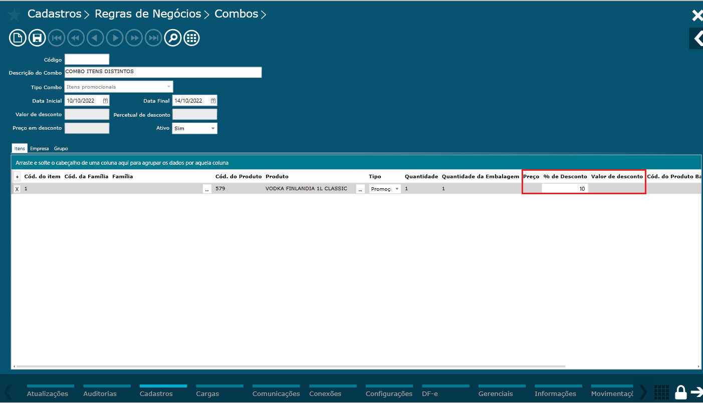 1) CADASTRAR COMBO POR DESCONTO FIXO