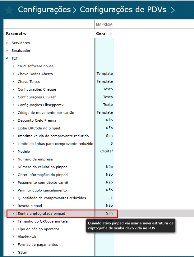 AcruxMonitor → Configurações → Configurações de PDVs → TEF → Senha criptografada pinpad