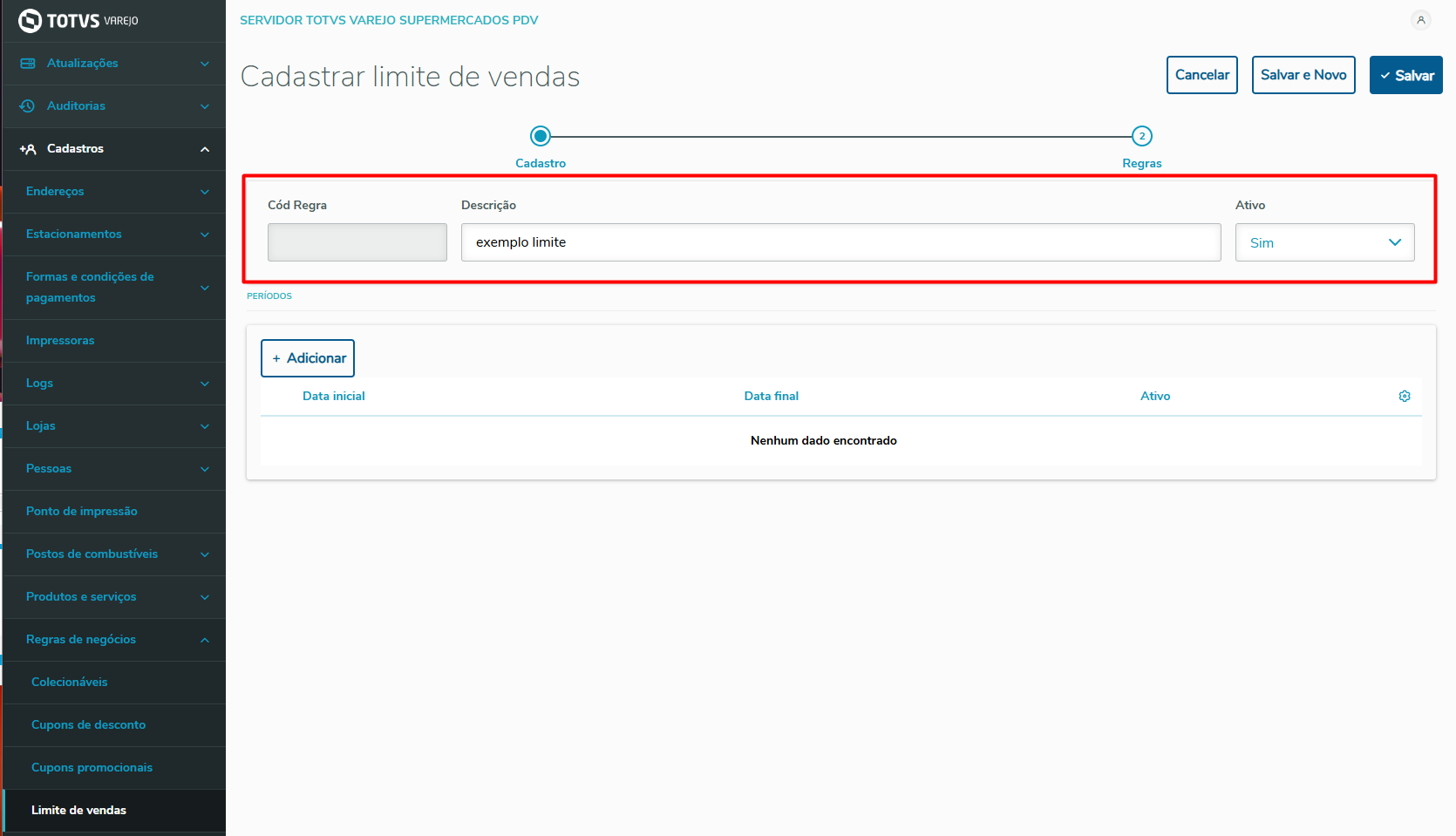 Imagem 3 - Campos da regra de limite de vendas.