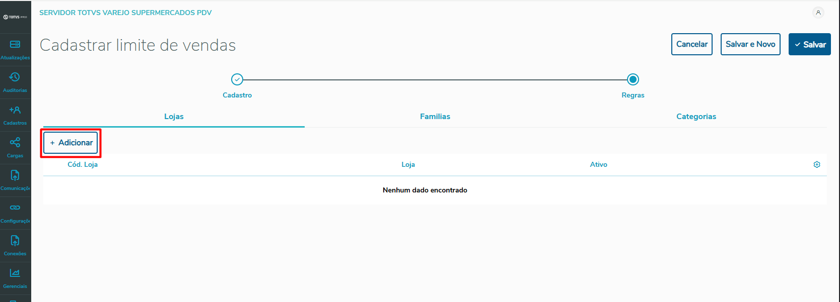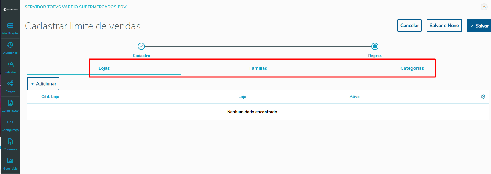 7 - Ao clicar na aba de regras a seguinte tela será aberta, nela é possível configurar a regra conforme a necessidade do cliente, podendo ela ter gatilhos por lojas, familias e categorias de produtos.