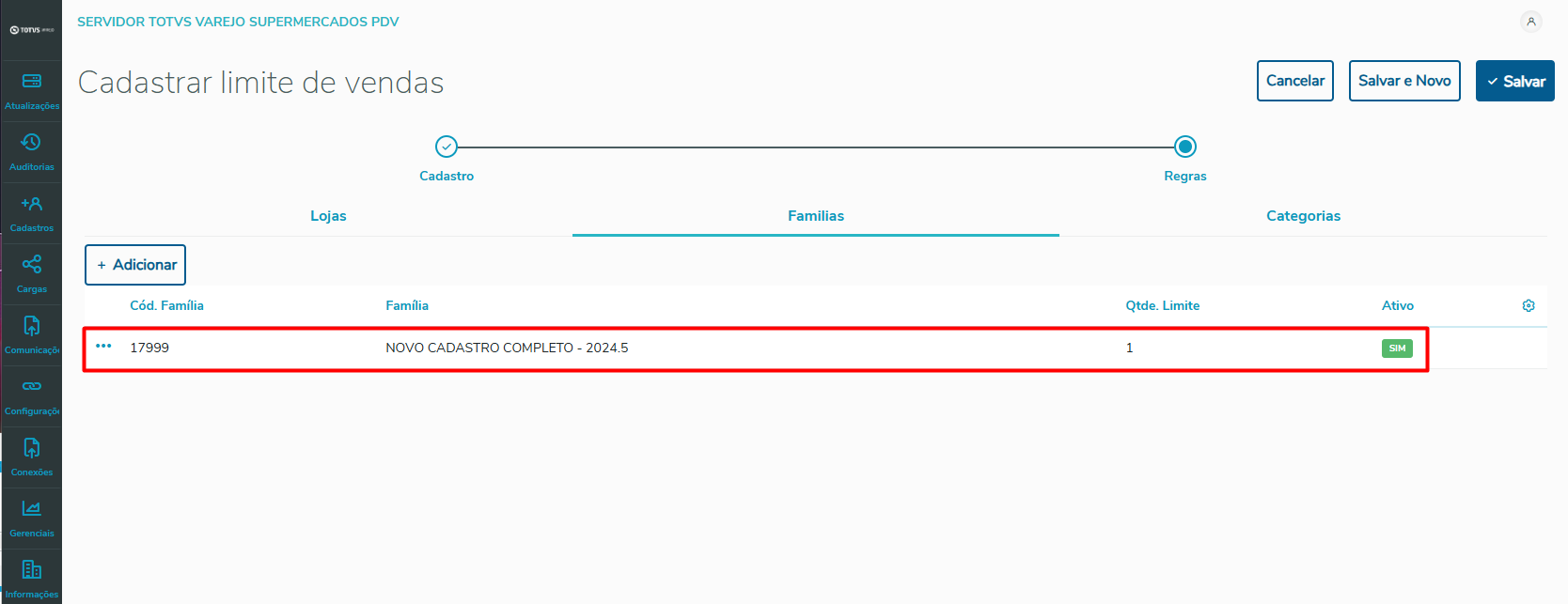 9 - Cadastro de famílias vinculadas à regra. Clique em + Adicionar.