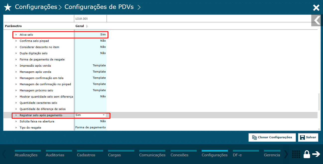 Monitor > Configurações > Configurações de PDVs > Regras de negócios > selos >