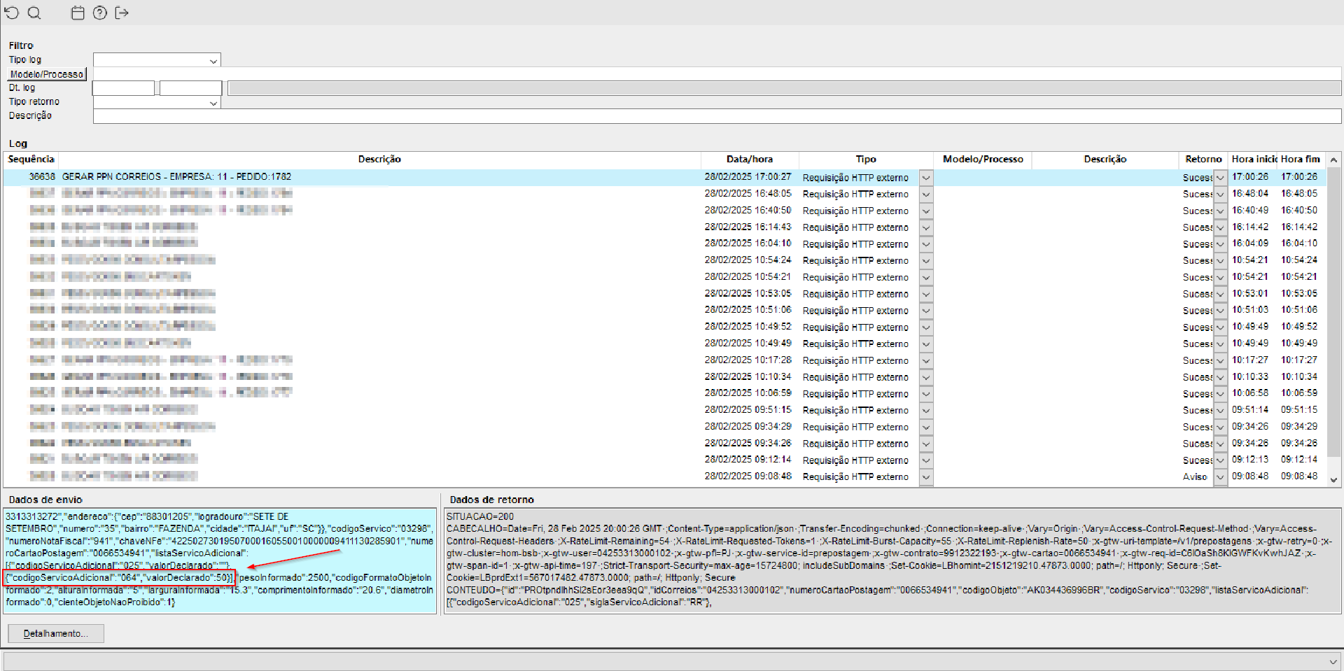 Imagem 03 - Demonstração de envio da informação "valorDeclarado" em conjunto com o "codigoServicoAdicional" 064.