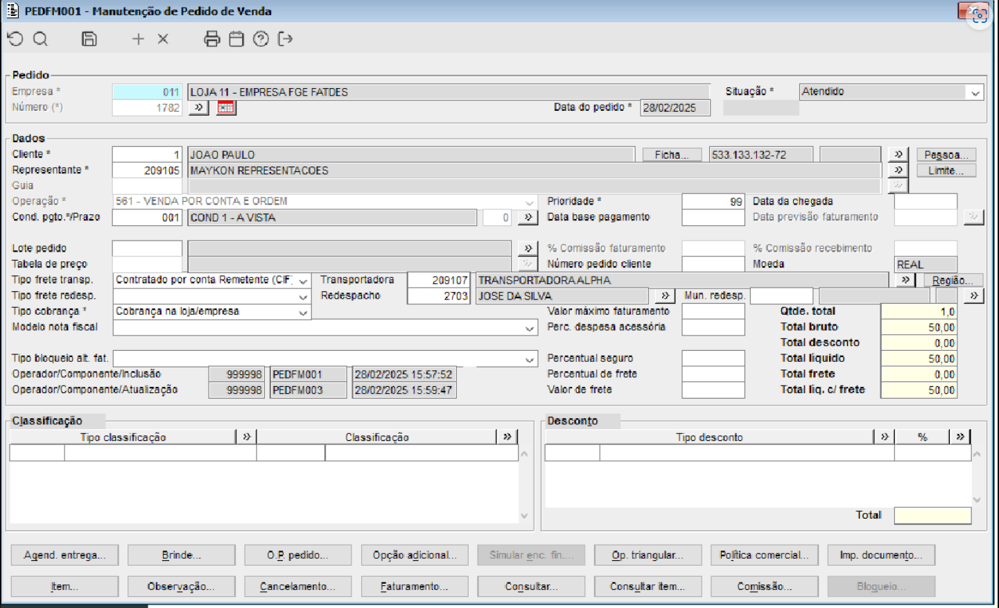 Imagem 01 - Pedido de venda 1782 criado para simular o envio das informações corretamente através da geração do PPN.