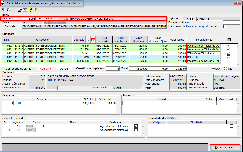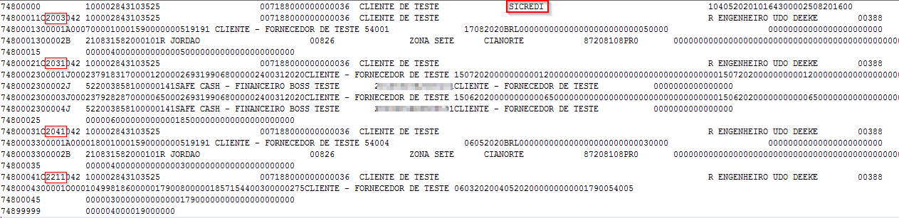 Imagem 1 - Na imagem acima antes da correção, iremos gerar uma arquivo de remessa para o banco Sicredi contendo vários títulos e tipos de serviço diferente. Pegaremos como exemplo os dois primeiros registros de pagamento de títulos de outros bancos, com código de barras do Bradesco.