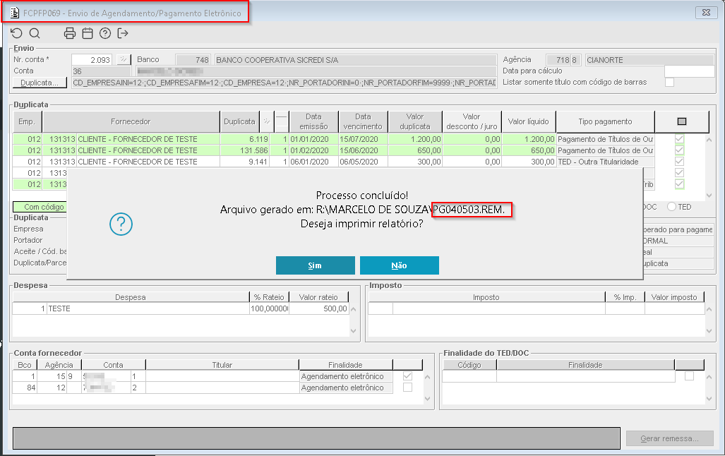 Imagem 4 - Após correção, realizamos um novo envio das mesmas informações ao Sicredi.