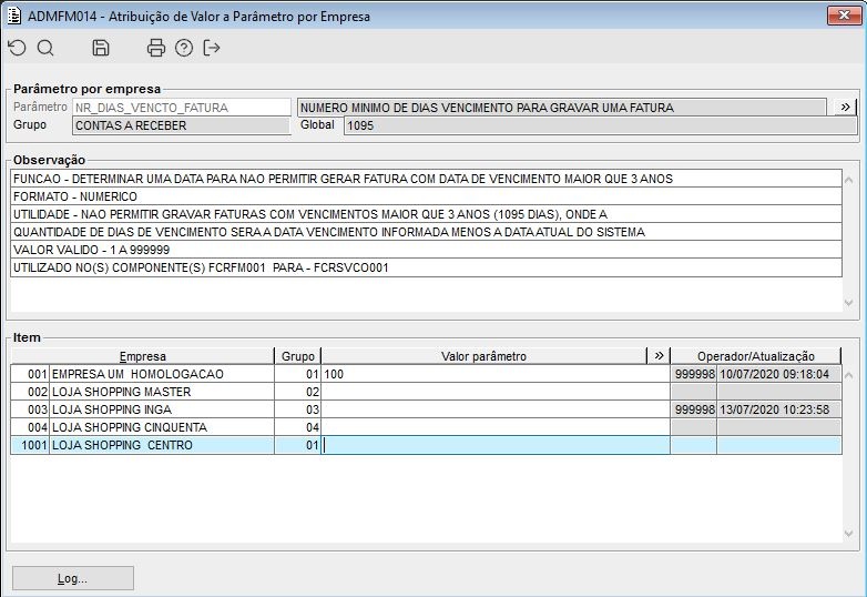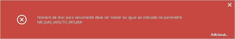 Determinar no parâmetro NR_DIAS_VENCTO_FATURA o prazo máximo para vencimento de faturas. Nesta empresa o máximo é 100 dias.