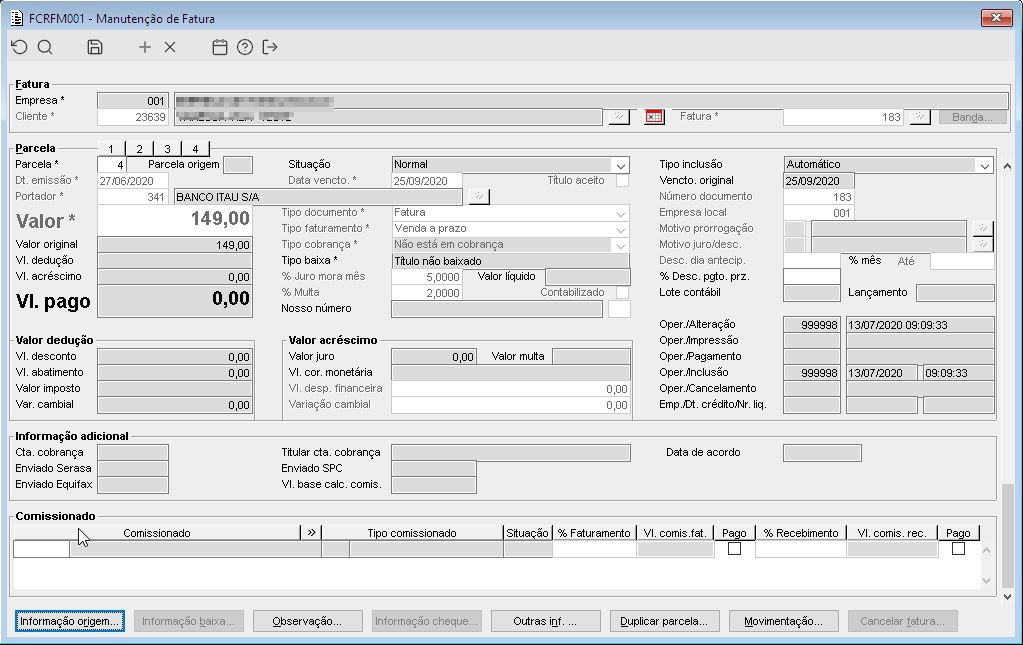 | Função: | Criando fatura duplicada na venda |