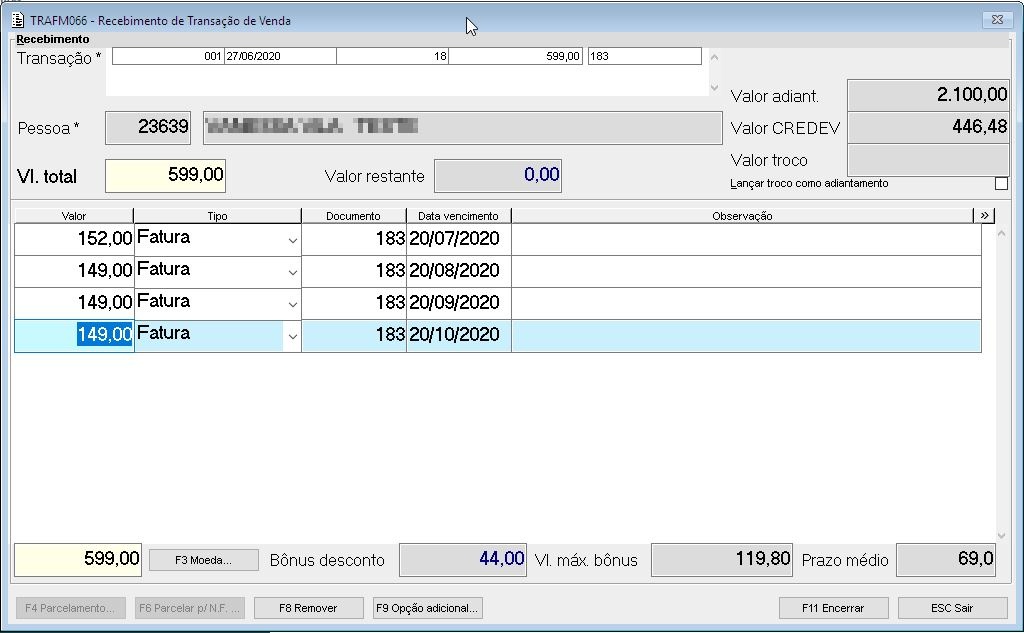 Efetuar uma venda utilizando uma forma de pagamento que gerará faturas com um prazo maior do que os 100 dias e efetuar o recebimento: