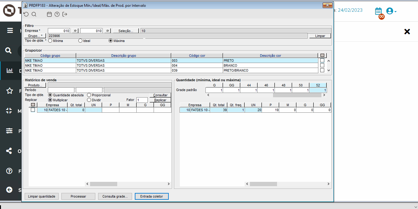Foi desenvolvido o componente PRDFP208 para realizar a leitura de arquivo com origem de coletor de dados, para que seja processada e sugerida a grade de quantidade mínima, ideal e máxima no PRDFP183.