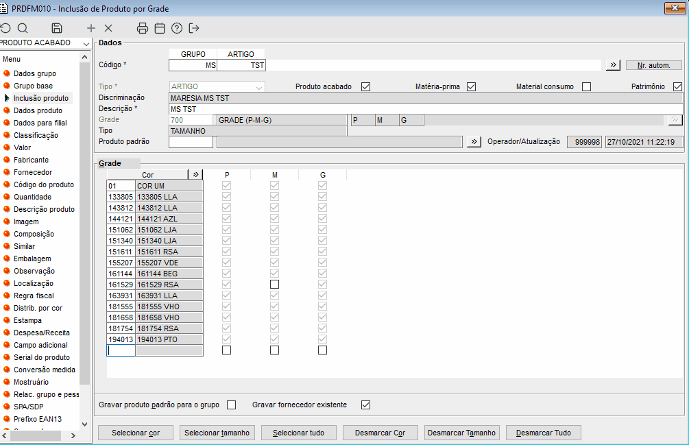 | Função: | PRDFL025 - Lista/Manutenção de Cor |