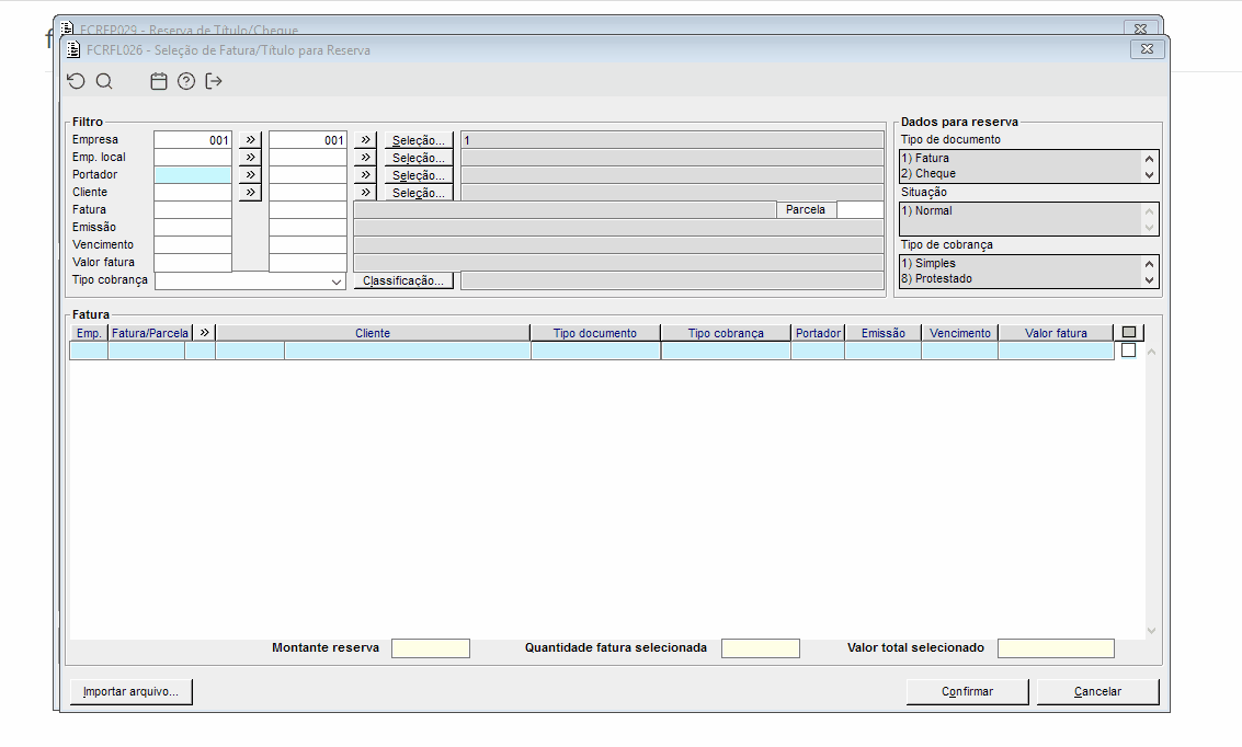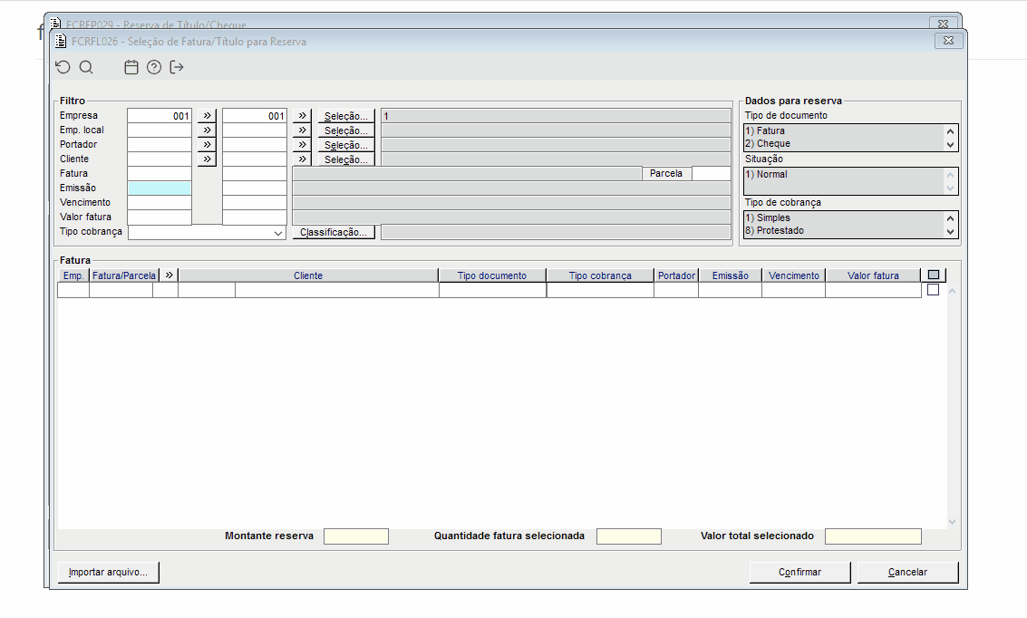 Neste primeiro momento a tela de busca das faturas (FCRFL026) que é utilizada pelo FCRFP029, recebeu três novas funcionalidades para facilitar a localização das faturas a serem lançadas em uma reserva: