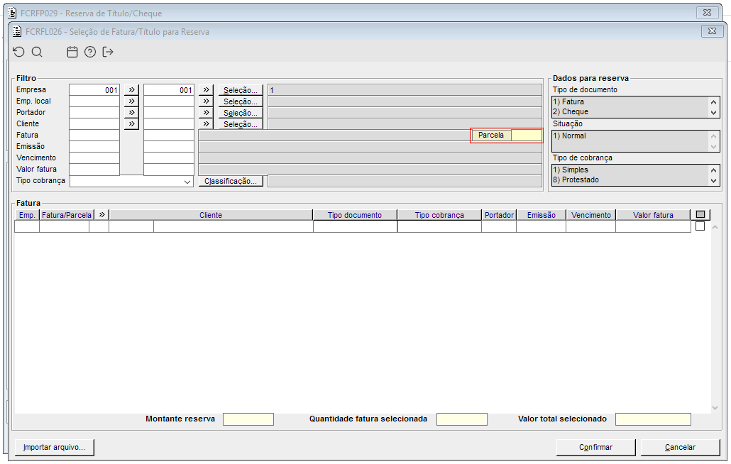 Imagem 3.01 - Um pouco mais a direita da opção de fatura e antes dos Dados para reserva, encontra-se agora o campo Parcela, que permite que seja informado qual o número da parcela que deseja que seja encontrada na fatura.