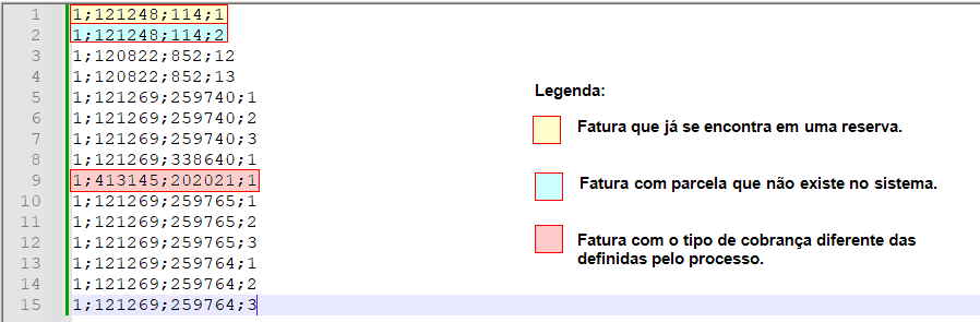 Imagem 3.01 - Demonstração do conteúdo do arquivo .TXT a ser importado pelo FCRFL026, onde nele além de possuir faturas que serão devidamente importadas, temos outras 3 situações distintas.