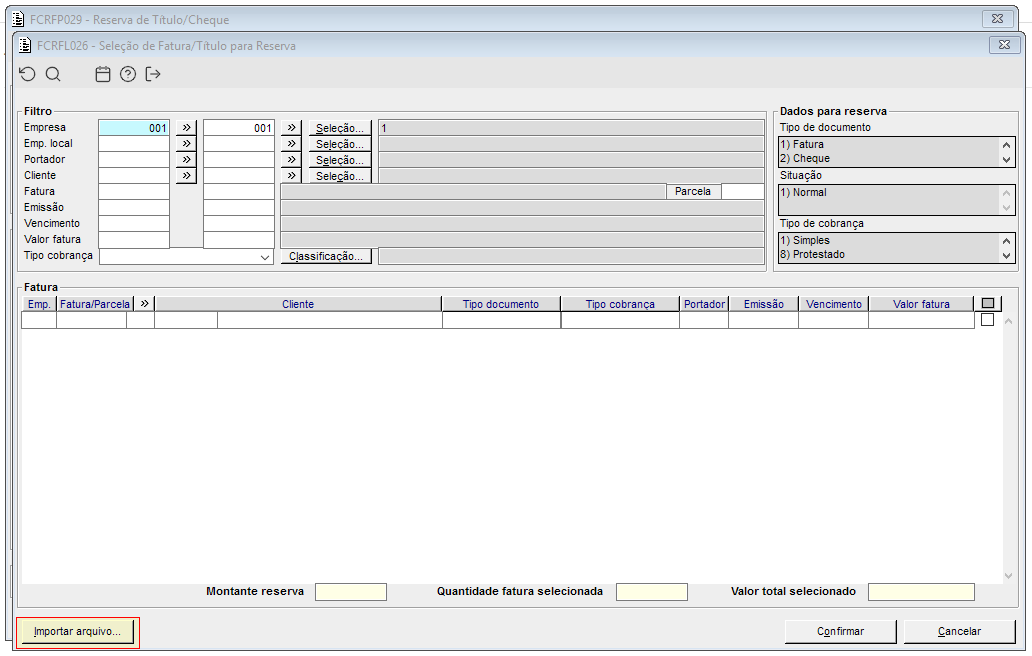 Imagem 3.02 - No canto inferior esquerdo, agora temos o botão de Importar arquivo... que realizará a chamada da tela do SISFFL043 para que o usuário possa selecionar qual o arquivo que contem as faturas que deseja importar;