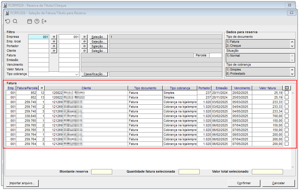 Imagem 3.03 - Demonstração da busca das faturas utilizando a opção se selecionar os clientes através da filtragem do PESFF004.