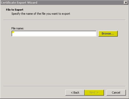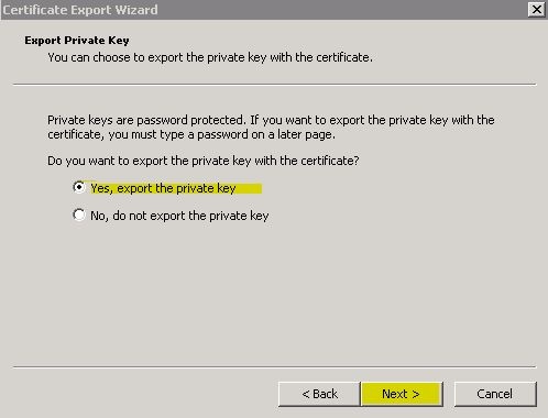 Ao abrir a nova aba, selecione o certificado que você deseja exportar, depois clique no botão "Export", e siga os exemplos a seguir.