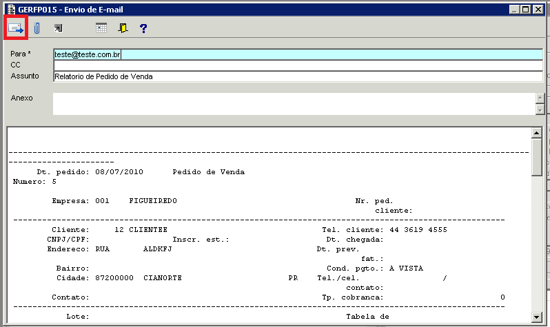 Ocorrência: | Envio de pedido de venda por email |