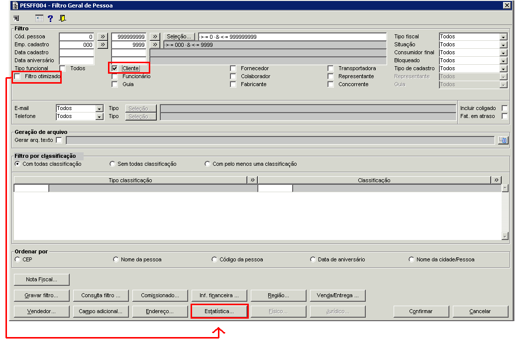 Na tela de filtros marquei o tipo funcional Cliente, desmarquei o filtro otimizado e pressionei o botão Estatística