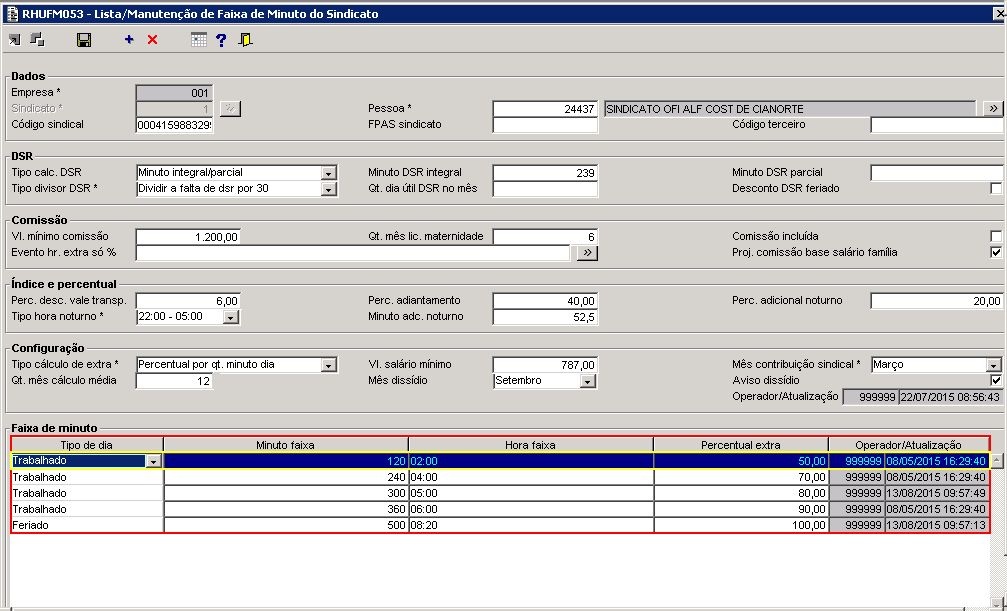 Passo a passo: | 1 - Acessar a tela RHUFM040 e informar o código do sindicato. 2 - Clicar no botão Faixa Extra que está localizado na parte inferior da tela. Ao clicar no botão será aberto a tela RHUFM053. 3 - Realizar a configuração das faixas de extras conforme a convenção coletiva. Segue abaixo um exemplo da configuração realizada. Imagem 1 - Faixas de extras cadastradas. 4 - Conforme a primeira faixa de extra cadastrada na Imagem 1, se um funcionário possuir até 120 minutos de horas extras será pago um adicional de 50%. Da mesma forma é realizado com as demais faixas. 5 - Exemplo do cálculo de hora extra para um funcionário que recebe R$ 1.000,00 de salário e que realizou 120 minutos de horas extras: a) R$ 1.000,00 (salário) / 220 (horas mensais) = R$ 4,5454 (valor da hora) R$ 4,5454 (valor da hora) * 50% (percentual de acordo com a faixa cadastrada) = R$ 2,2727 (valor do adicional sobre uma hora) R$ 4,5454 (valor da hora) + R$ 2,2727 (valor do adicional sobre uma hora) = 6,8181 (valor total de uma hora extra) R$ 6,8181 ((valor total de uma hora extra)) * 2,00 (quantidade de horas centesimais) = R$ 13,64 (valor total das horas extras). |