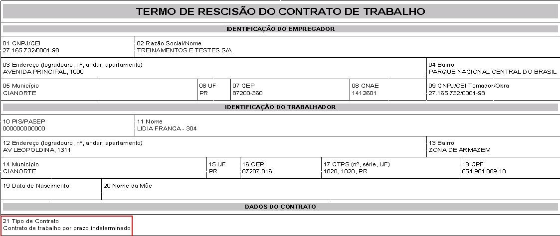 Passo a passo: | Esta informação será apresentada no campo 21 - Tipo de Contrato da impressão do Termo de Rescisão através do RHUFP037. Porém, a informação deste campo será automaticamente alterada para: 1 - Contrato de trabalho por prazo indeterminado caso seja calculada uma rescisão com data maior do que o campo Dt. fim contrato. Imagem 1 - Campo 21 - Tipo de Contrato do Termo de Rescisão. |