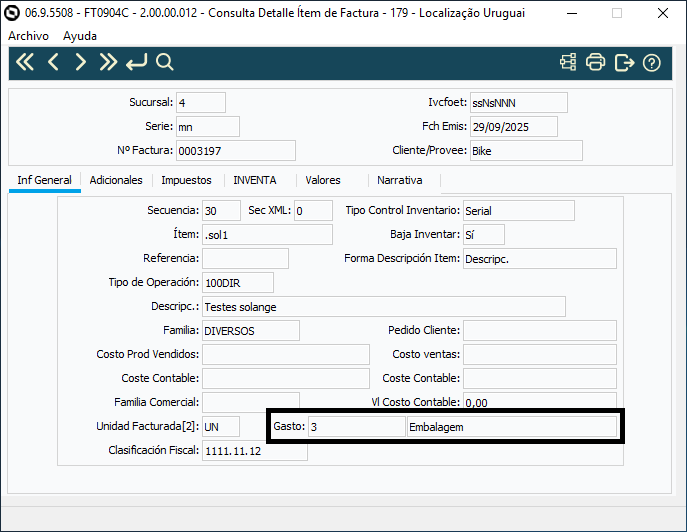En la pestaña Información General del programa Consulta Detalle del Ítem Factura (FT0904C), se agregó el campo Gasto y la Descripción del Gasto vinculado al ítem. Esta información se mostrará cuando el ítem se haya originado a partir de un gasto.