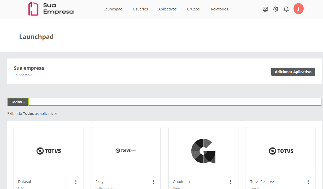 O launchpad é o espaço a partir de onde o usuário realiza o acesso a todos os aplicativos atribuídos a sua conta no TOTVS Identity.