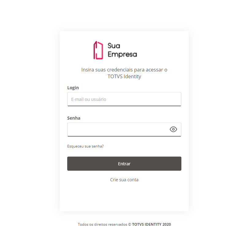 A página de login é o portal por onde as pessoas acessam a empresa no TOTVS Identity. Para acessar a página de login, informa-se o domínio da empresa na barra de endereços do navegador, por exemplo: https://suaempresa.fluigidentity.com.