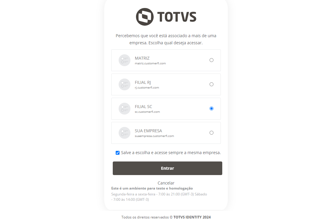 04. Marque a opção Salve a escolha e acesse sempre a mesma empresa para definir que sempre será a empresa acessada.
