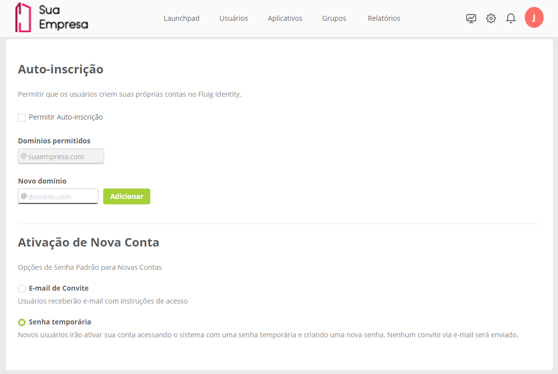 As configurações disponíveis nesta aba permitem habilitar a auto-inscrição de usuários na empresa e definir a opção que deve vir pré-selecionada na ativação de senha padrão no cadastro de um novo usuário.