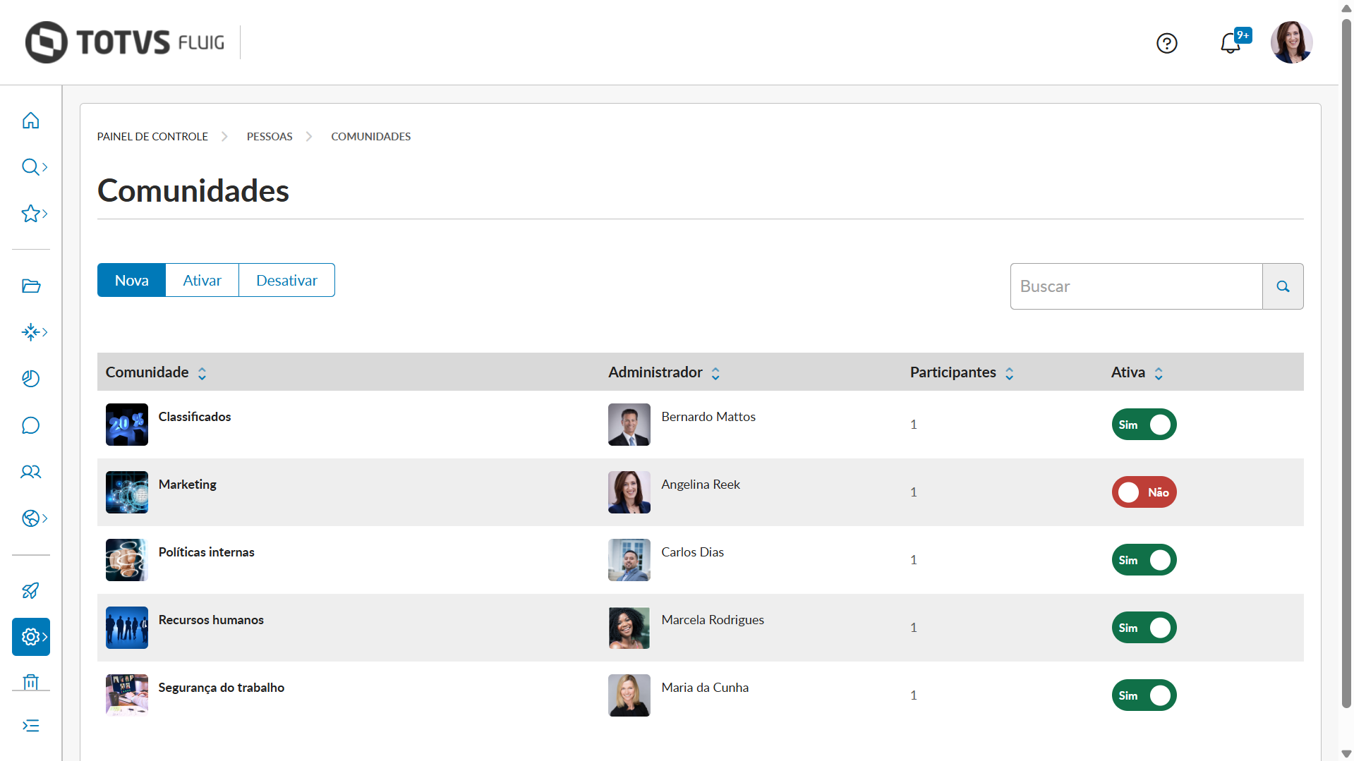 01. Na janela Comunidades, localize a comunidade que será ativada/desativada.