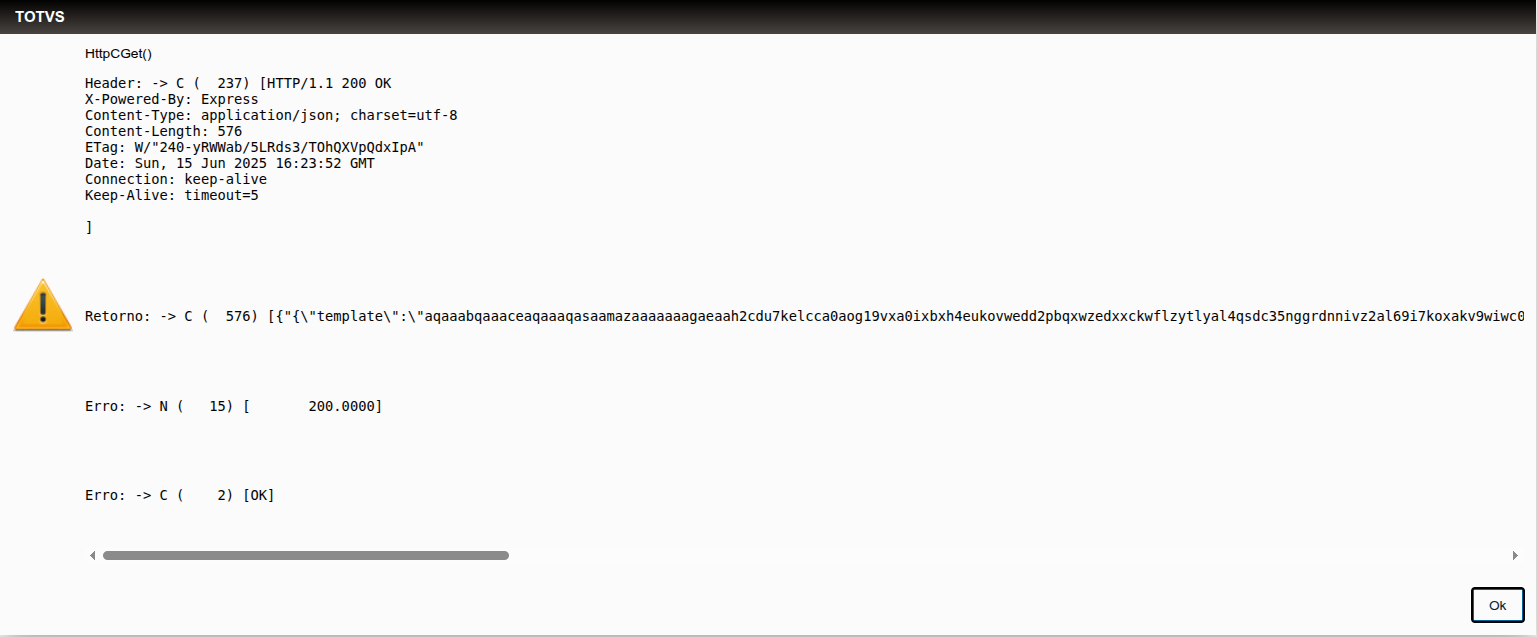 cHeaderGet | caractere | Indica a string que conterá o header de resposta HTTP enviado pelo servidor requisitado. Observação: A variável deve ser declarada antes da chamada da função. | X |