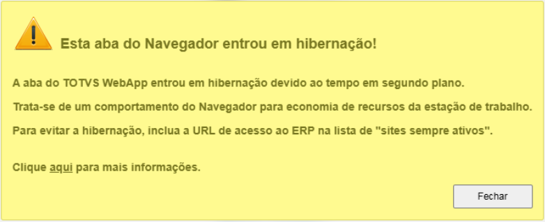 Quando a aba do navegador com o Protheus/Logix entrar em hibernação será exibida a mensagem a seguir.