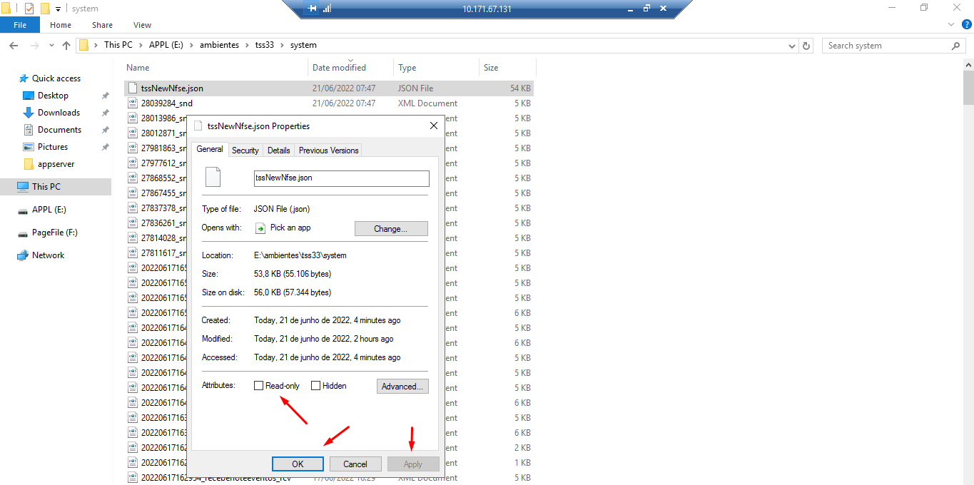 4. Após a aplicação do pacote no TSS edite o Appserver.ini para ativar o JOB do TSS e Reinicie e TSS. 5. ** IMPORTANTE ** Somente depois do pacote aplicado e TSS com JOB ativo, acesse a pasta do pacote enviado do TSS e copie o arquivo tssNewNfse.JSON e salve na pasta system do TSS; 6. Clique com o botão direto do mouse no arquivo e acesse as propriedades do arquivo. Desmarque a opção "somente leitura" caso esteja marcada; 7. Verifique que o arquivo seja apagado ( tssNewNfse.JSON ) da pasta system automaticamente pelo TSS. 8. Se arquivo não foi apagado da pasta system, entre na APSDU do TSS, filtre Tabela SPED000 e apague o conteúdo do parâmetro MV_VERNFSE do TSS e refaça o procedimento; 9. Após conclusão, reinicie o TSS. ***** I M P O R T A N T E
