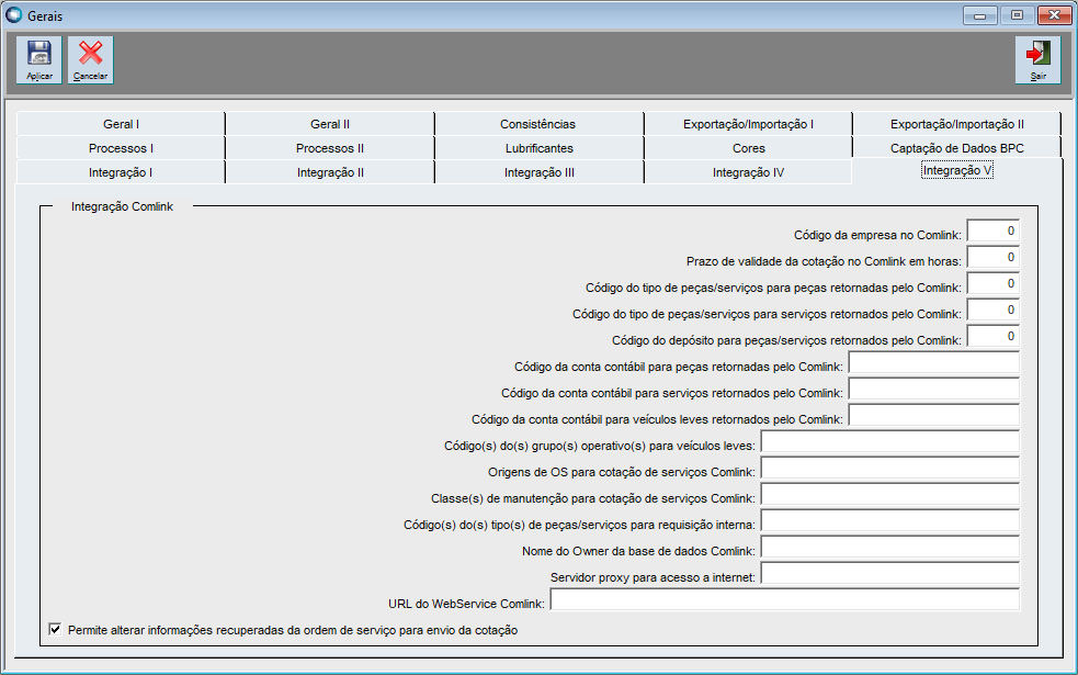 | Permite alterar informações recuperadas da ordem de serviço para envio da cotação | Define se irá permitir a alteração das informações recuperadas da O.S. para o envio da cotação de serviço. |