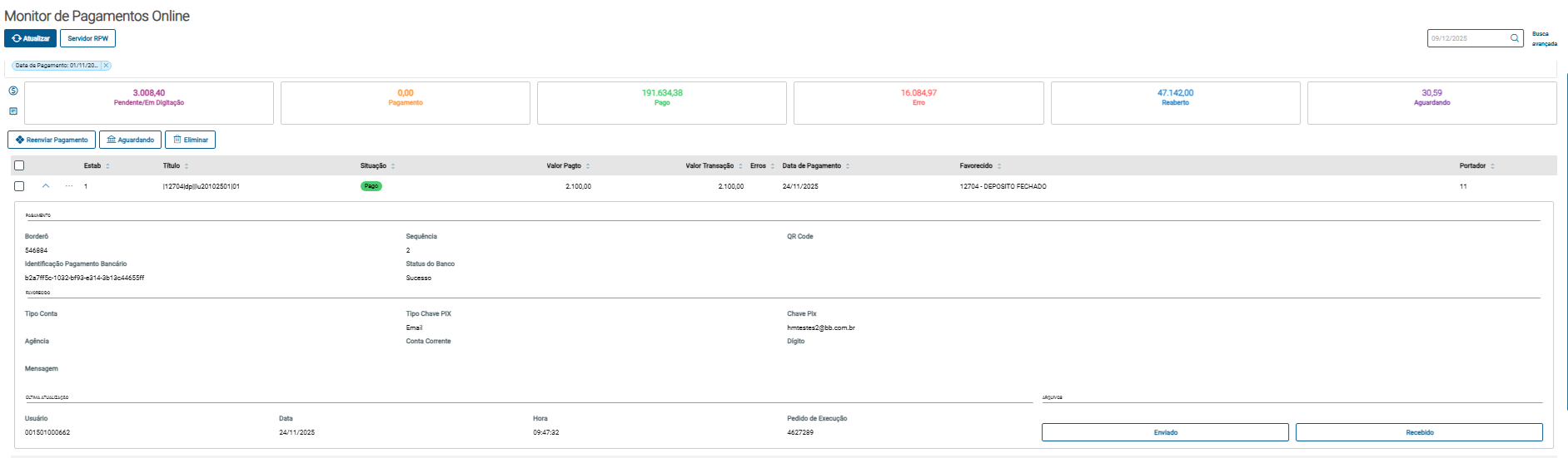 A tabela do Monitor de Pagamentos Online exibe as principais informações de cada pagamento. Para acessar detalhes mais específicos, é possível expandir a linha do título por meio do botão . Ao expandir, são apresentadas informações complementares, como dados do pagamento, favorecido, atualizações realizadas e a possibilidade de visualizar os arquivos JSON trocados com o banco.
